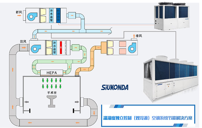 對(duì)于大、中型手術(shù)部,西屋康達(dá)推薦采用溫濕度獨(dú)立控制(雙冷源)空調(diào)系統(tǒng)節(jié)能解決方案
